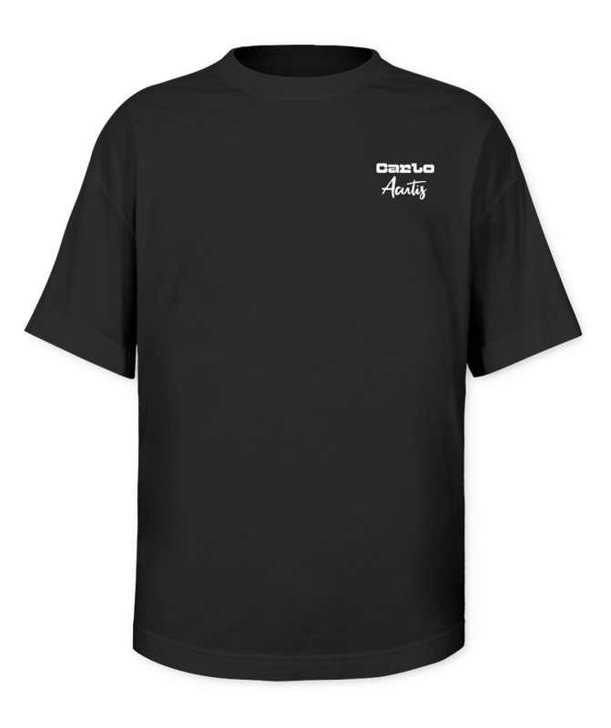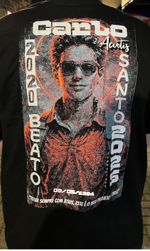 Camiseta Oversized Carlo Acutis Estilo urbano, caimento confortável e uma mensagem eterna: "Estar sempre com Jesus, este é o meu projeto de vida!" 🙏 De 2020 (Beato) a 2025 (Santo) — uma peça que une fé e atitude. #CarloAcutis #Oversized #VistaSuaFé #GemmaStore
